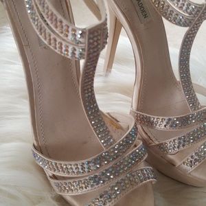 Cream or light gold colored heels with rhinestone detailing