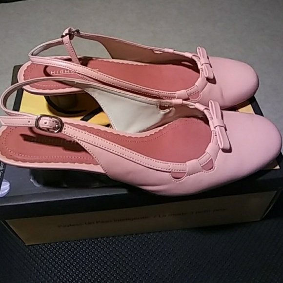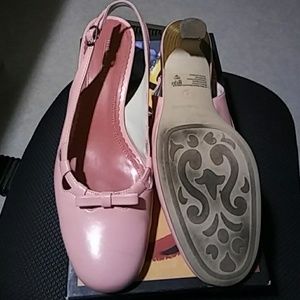 Patent leather sling back, bow on top front of shoe 1 1/2 in. Worn, heel in very good shape