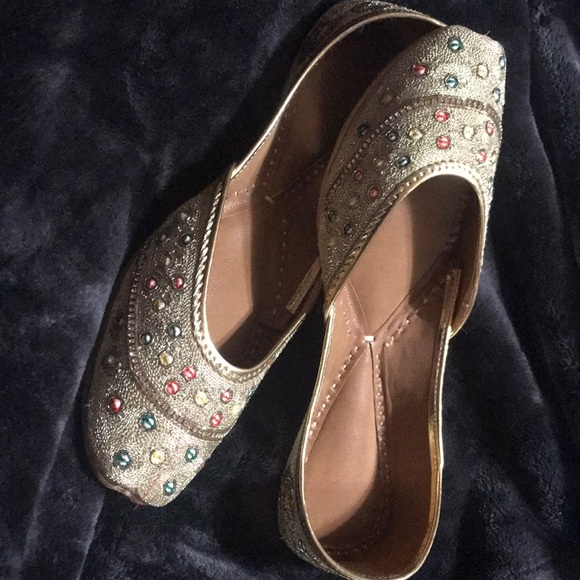 Traditional hand embroidered punjabi shoes in light gold with gold stones on it with high quality padding inside for comfort. Color is an elegant gold and can be worn with every outfit