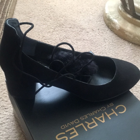 Charles David suede black shoes with mink balls that tie around the ankle.