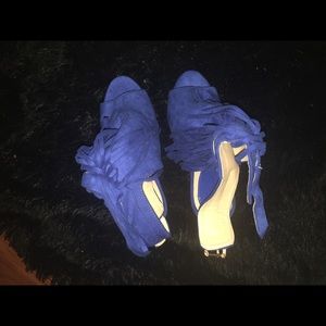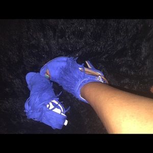 Beautiful blue heels with fringe all around the ankle, open toes, and open heel.💖