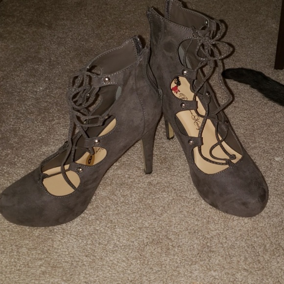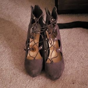 Darkish green and grey colored shoe. Never worn outside of house. Look super cute with skinny jeans. Cat tail in pictures not for sale...she just wouldn't move lmao