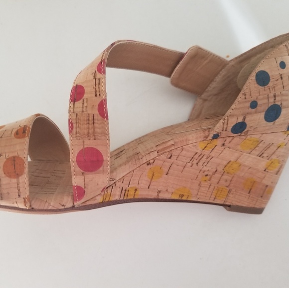 Cute platforms . Tan with yellow , red, blue dots. Never worn, just tried on.