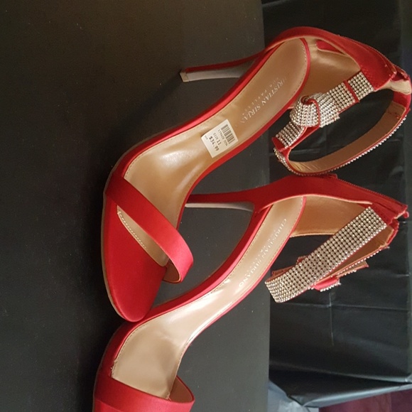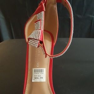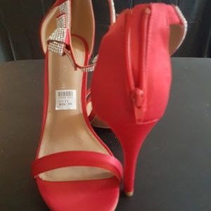 Red satin with rhinestone trimming. Zip up in back. Worn once. 4 inch heel