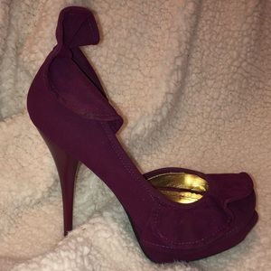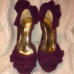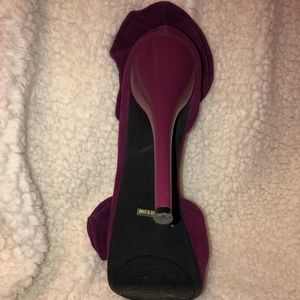 3in heels!! Slightly worn plum colored heels. Open toe, has nice fabric overlay at heel and toe areas. Velvet like material. 💜