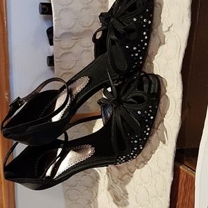 New w/o tags Black Satin with rhinestone embellishments. Front of shoes has an open butterfly design with bow. Buckle also trimmed in rhinestones. Leather bottoms....size 39. Beautiful shoes!