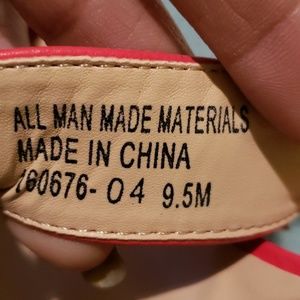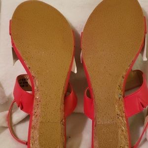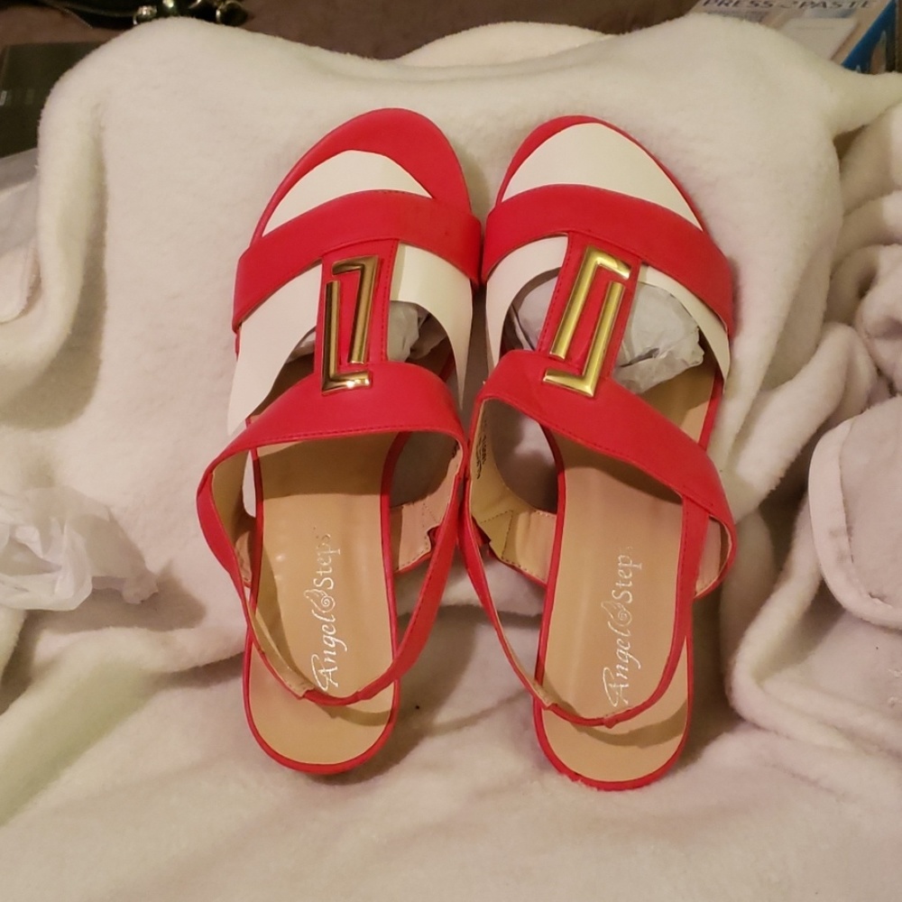 Red sandals with gold hardware they have cork wedge made by Angel Steps heels have specks of different colors they are size 9.5M