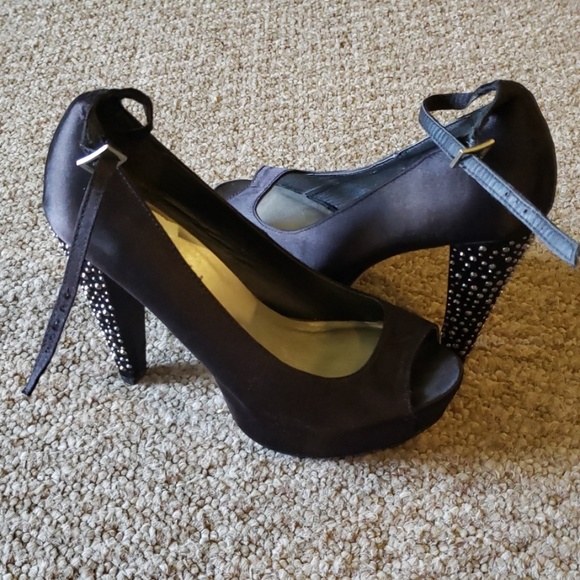Black heels, buckle at the ankle, silver and black rhinestones on the heels