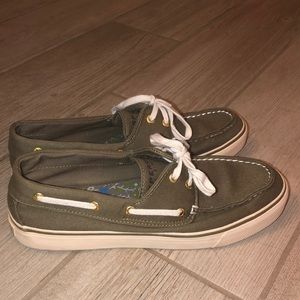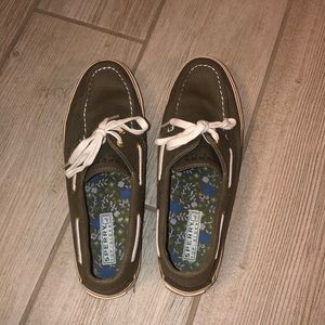 These grass green Sperry Top Siders are great for a casual outfit in the spring. They also have a super cute flower design in the shoe! Worn about 2 times.