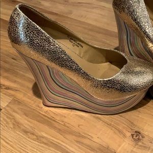 ♥️♥️♥️Disco colored wedges!! One pair gold, the other silver!! Selling together, && will not separate!! Brand new never worn due to spine injury!! Both are size 10, && very comfortable!! Multi colored wooden heel!!