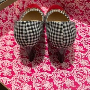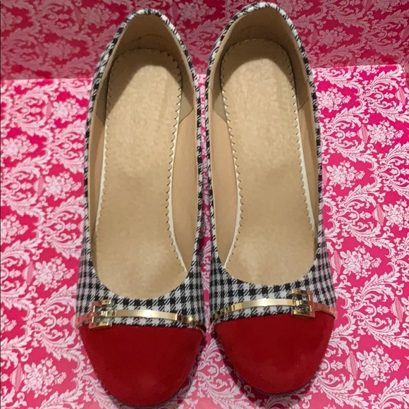Checker board print , sueded front , 3 inches I believe ☺️ nice causal shoe