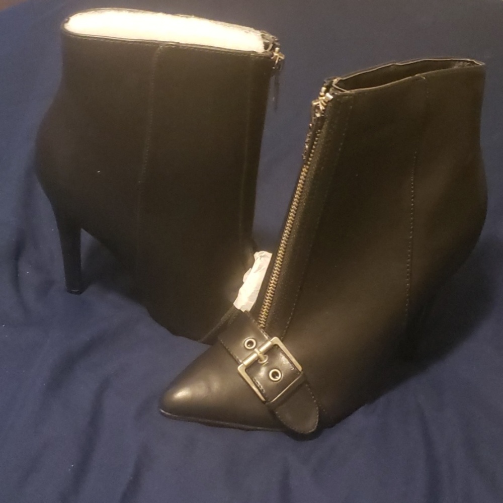 Black leather booties with a buckle on the side