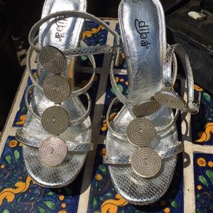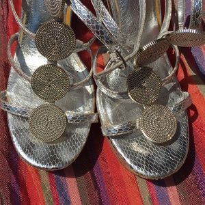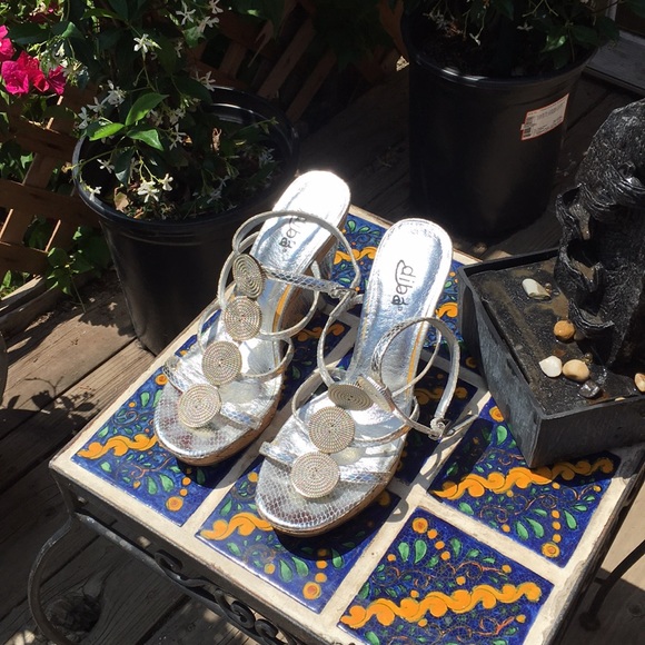 Silver shoes wedge heels part silver part cork material. Size runs small marked 71/2 fits 61/2. New never worn no tags.