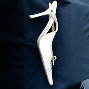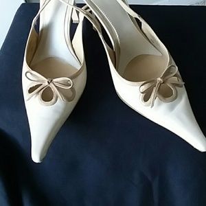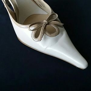 Delicate bow on toe, v-tipped toe, 3" heels. Cream color with tan accents.