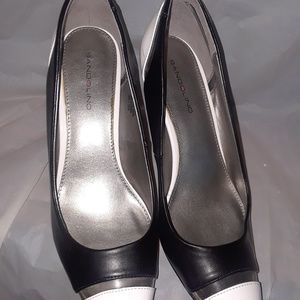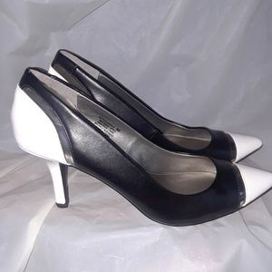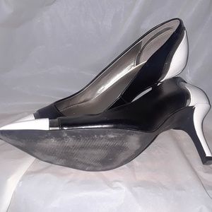 Classy black and white pump perfect for office to club. Black and white pointed toe will go well with business suit or party outfit.