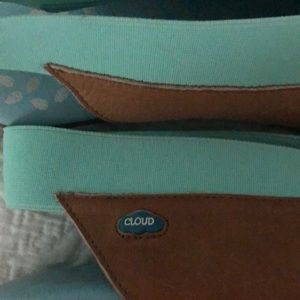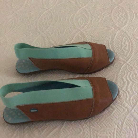 Worn half a season. Bought too small. Super comfy open toe sandal with wide elastic strap around ankle. Peep toe.