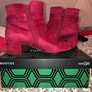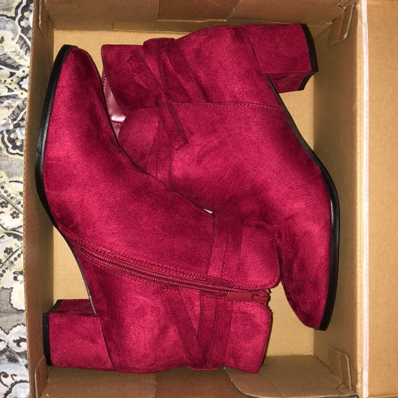 They’re red, with a little heel. The shoes have a cute little bow on the side of the boot. They have zippers as well on the side.