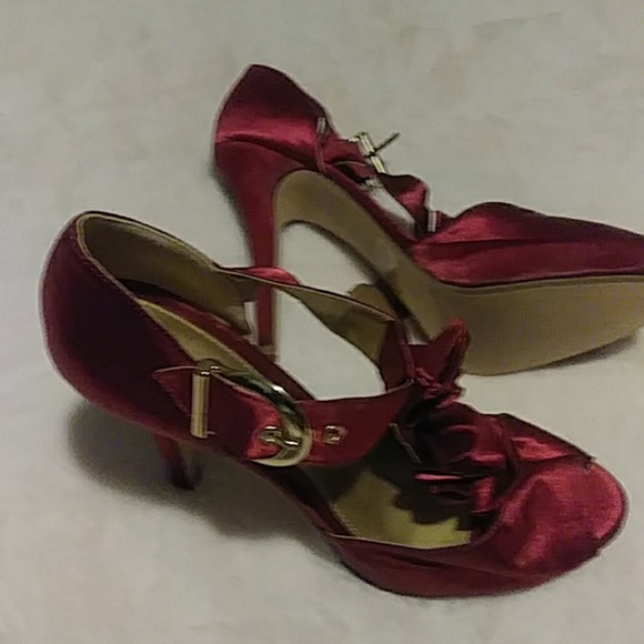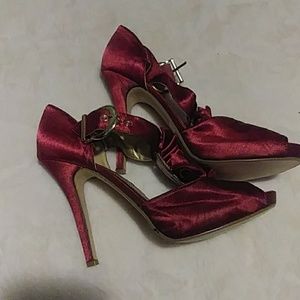 Satin burgundy heel w gold buckel