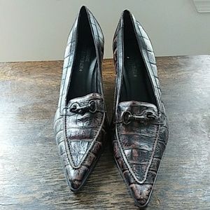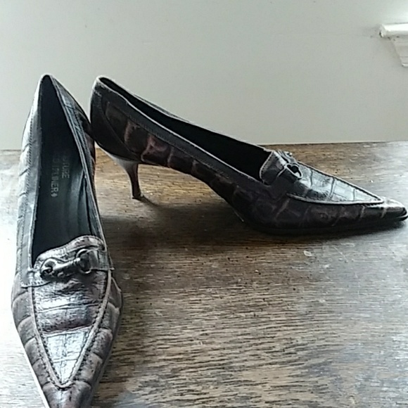 Two toned brown and nude pointy toe shoes with small buckle in front and a 2 inch heel.
