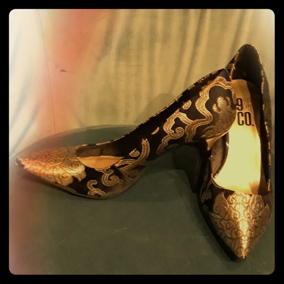 Black/Gold embroidery with patent leather heel never worn