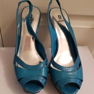 Turquoise, snake skin, sling back platform sandal. Worn once.