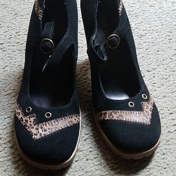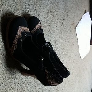 Black suede pump with leopard detail, never worn.