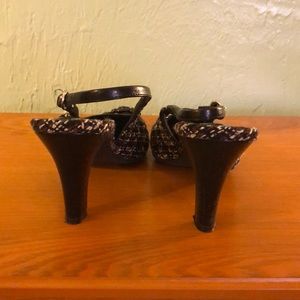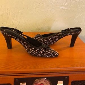 Brand new black tweed sling backs they have white and brown in them 3 inch heel brand new never worn