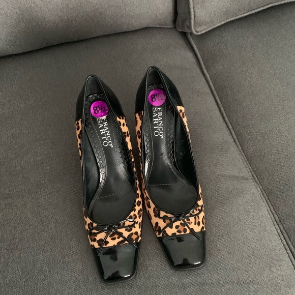 Black 2 1/2 inch heel patient leather and leopard calf hair shoes