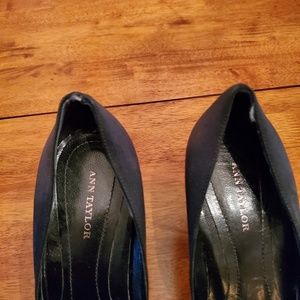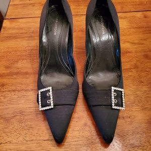 Black suede/satin like feel shoe with silver belt buckle on sides. Size 8.5 Med. Great for holiday or party