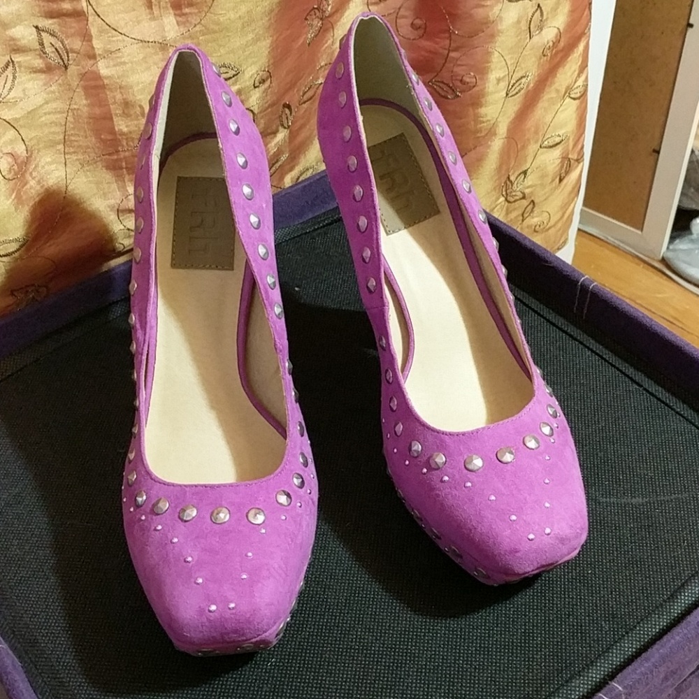Fuchsia suede-like material with silver studs. Never worn. Very comfortable 3.5" heel with 1" platform (so that's 2.5" heel). Size 10 but feel smaller, like 9.5.
