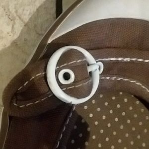 Brown with a strap buckle on the heel and the toe and polka dotted.
