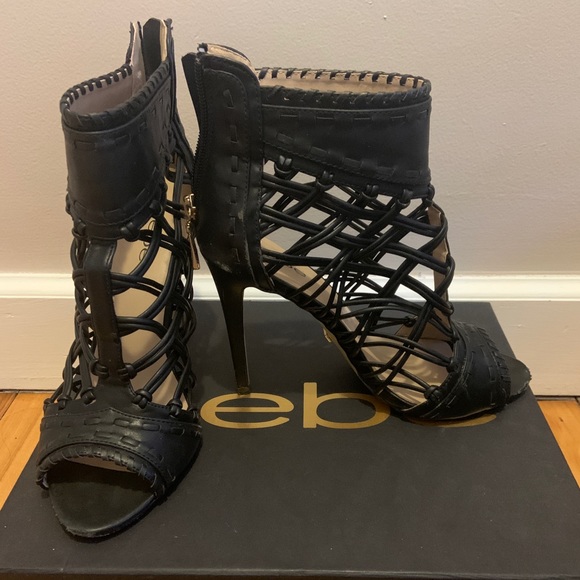 Strappy black Bebe heels. Worn once for a bachelorette. Scuffed toes (shown in picture). Gold accent zipper!