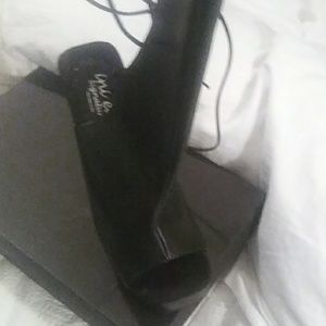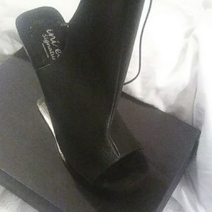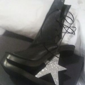 Black leather lace back open toe designer collection made in the USA. Size 9. Silver glitter star