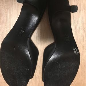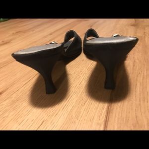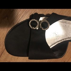 Gently worn kitten heeled dress slide sandals with rhinestone detail. Set against a satiny material. Very comfortable and stylish! Leather sole.