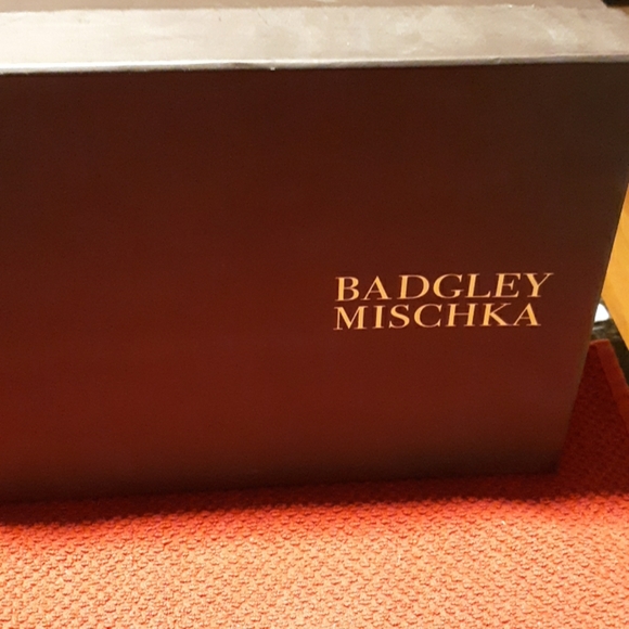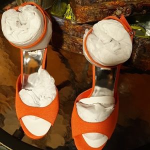 Absolutely stunning, brand new BADGLEY MISCHKA SIZE 10 high heels, in original packaging with shoe bag. They have buckle strap closure, open toe, silver footbed, leather sole, they are orange in color, silver tone BAGLEY MISCHKA EMBLEM ON BOTTOM OF FOOTBED, VERY CLASSY RHINESTONE LIKE DESIGN ON HEEL. WOW, WOW, AND WOW AGAIN.. WOOHOO.