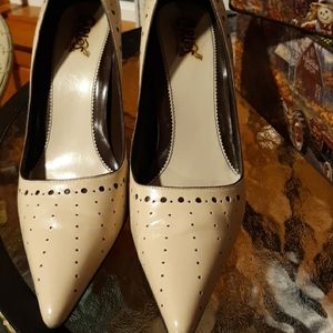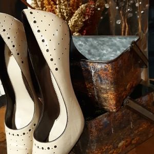 REALLY pretty high heels shoes, size 10, CARLOS By CARLOS SANTANA. GREAT CONDITION, ONLY WORN 3 TIMES, creme in color, with cutout circle design, leather upper, balance man made. Woohoo..