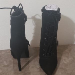 Black high heel booties with lace up and buckles