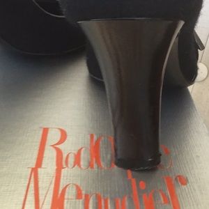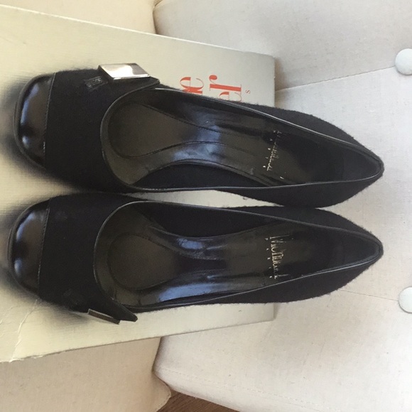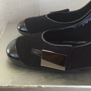 Elegant black shoes in mixed materials with accent buckle and leather design trim. Very comfortable. Great for work, elegant dinner of events. Gently worn and in great condition. 3.5 inch heels