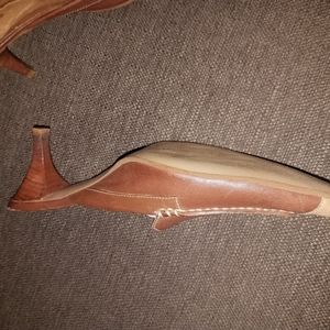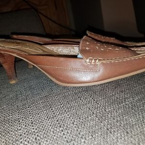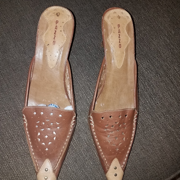 Two tone tan and beige leather slide in with one inch small heel Multi design
