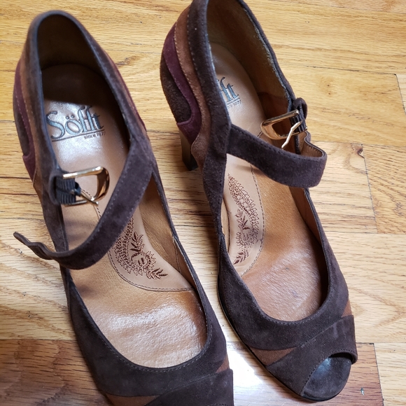 Hardly worn, vintage feel, open toe, ankle strap, 3 1/2" heel. Brown, tan and burgundy color strips.