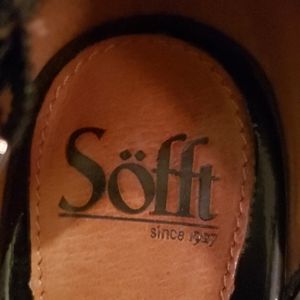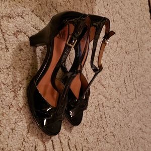 Black patent leather shoes from Sofft brand. Nice T strap style heel shoe. Heel measures 3 inches.They are SUPER comphy. Bought to wear with a dress for a wedding. Worn once. I love them but I should have bought one size up. The open toe gave the evidence to me! But the shoe ....its great! Like new. EXCELLENT condition.