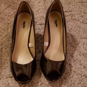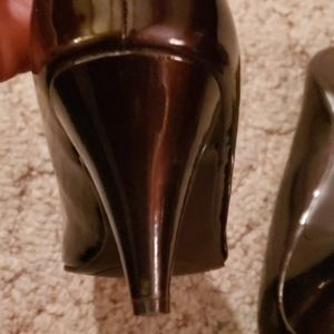 Brown patent leather like shoes. Man made material. Heel measures 2 1/2 inch. Some cushion in footbed. Nice for dress or casual! Comfortable