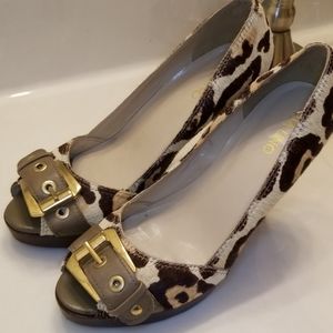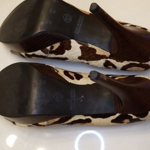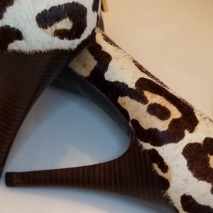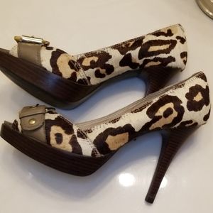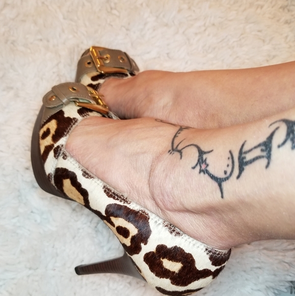 Platforms heels ..unique design nude leopard calf hair. I worn few times and looks really good size 7 and heels 4
