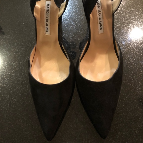 Hi, Very interested in purchasing. What is the style name that is on the Manolo Box? What is the condition of the suede? Do the shoes have any tears or scuff marks on the suede on the heals or the body of the shoes? Have these been re-soled or is the black patch on the bottom to prevent slipping? Thanks
