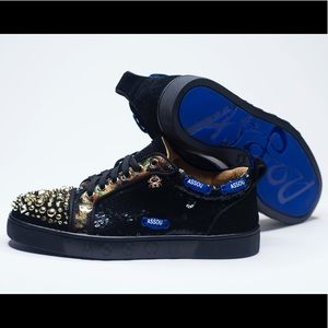 worn “Charbon Noir by Marie-Josée" is a melting pot of different fabrics and materials. Black sequin on vamp and quarter, counter in total black suede, tounge in colorful recycled plastic combined with a bunch of multi shaded golden metallic stud on the toe cap. Lace-up with uniformed black color midsole and labeled royal blue outsole. Worldwide shipping on www.assoucollections.com IG @assoucollection