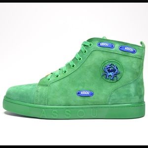 "Natura" have been crafted with a combinaison of different shades of green color. Totally made in an emerald suede fabric well combined with parakeet lace, shamrock metallic eyelets and basil rubber insole. And the labeled royal blue outsole. Www.assoucollections.com