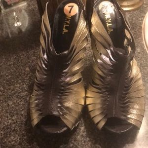 Beautiful gold sandal. Perfect with a dress or jeans. Very chic..... heel is 4.5. It’s a shoe you can dress up or down. Never been worn.
