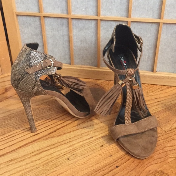 Brown with tassels in the front and opened toe. The front has the look of suede.Snake skin look on the back heel.