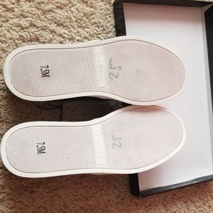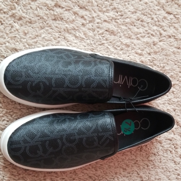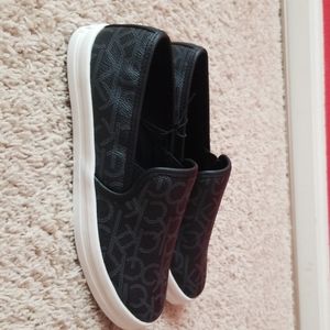 New Calvin Klein slip-on shoes; size 7.5; blakc/gray;man-made materials; made in Vietnam.