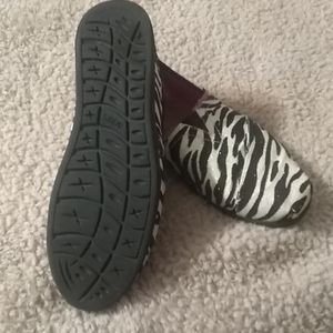 Sparkly zebra print with plush pink lining top and sides of this comfortable Bob's from Sketchers brand fun flat. Outer is cloth with leather insole.